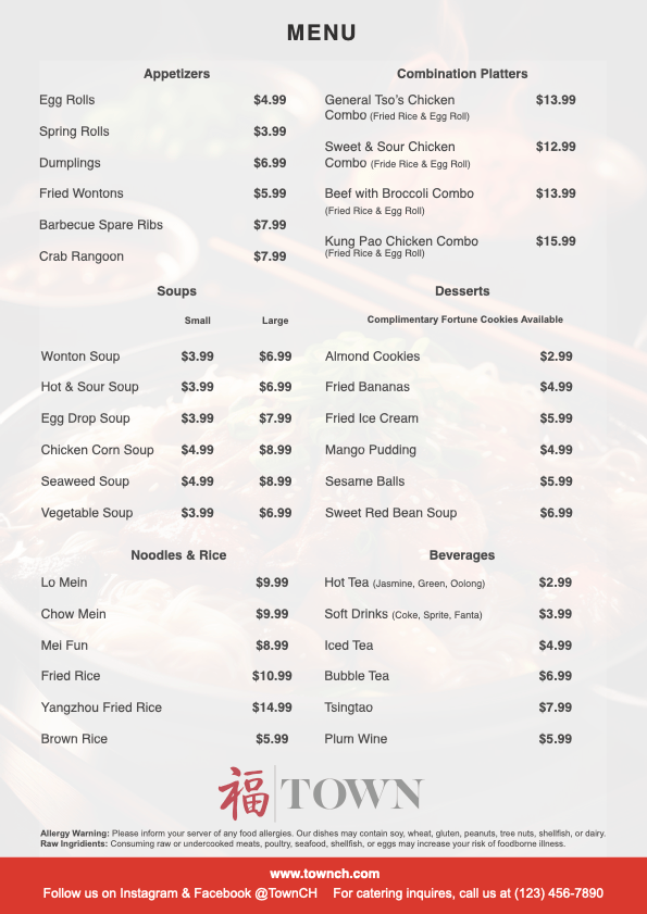 Designed a modern menu for Town, a Chinese restaurant, with the idea of elevating their dining experience through organization. The project focuses on improving readability and not overwhelming guests with a lot of options. It keeps its visual appeal, while staying true to the restaurant’s authentic roots.